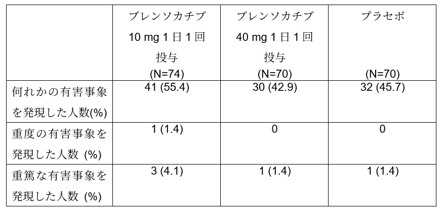 - 安全性プロファイルはこれまでの試験結果と一貫しており、ブレンソカチブのいずれの用量においても新たな安全性シグナルは認められなかった。